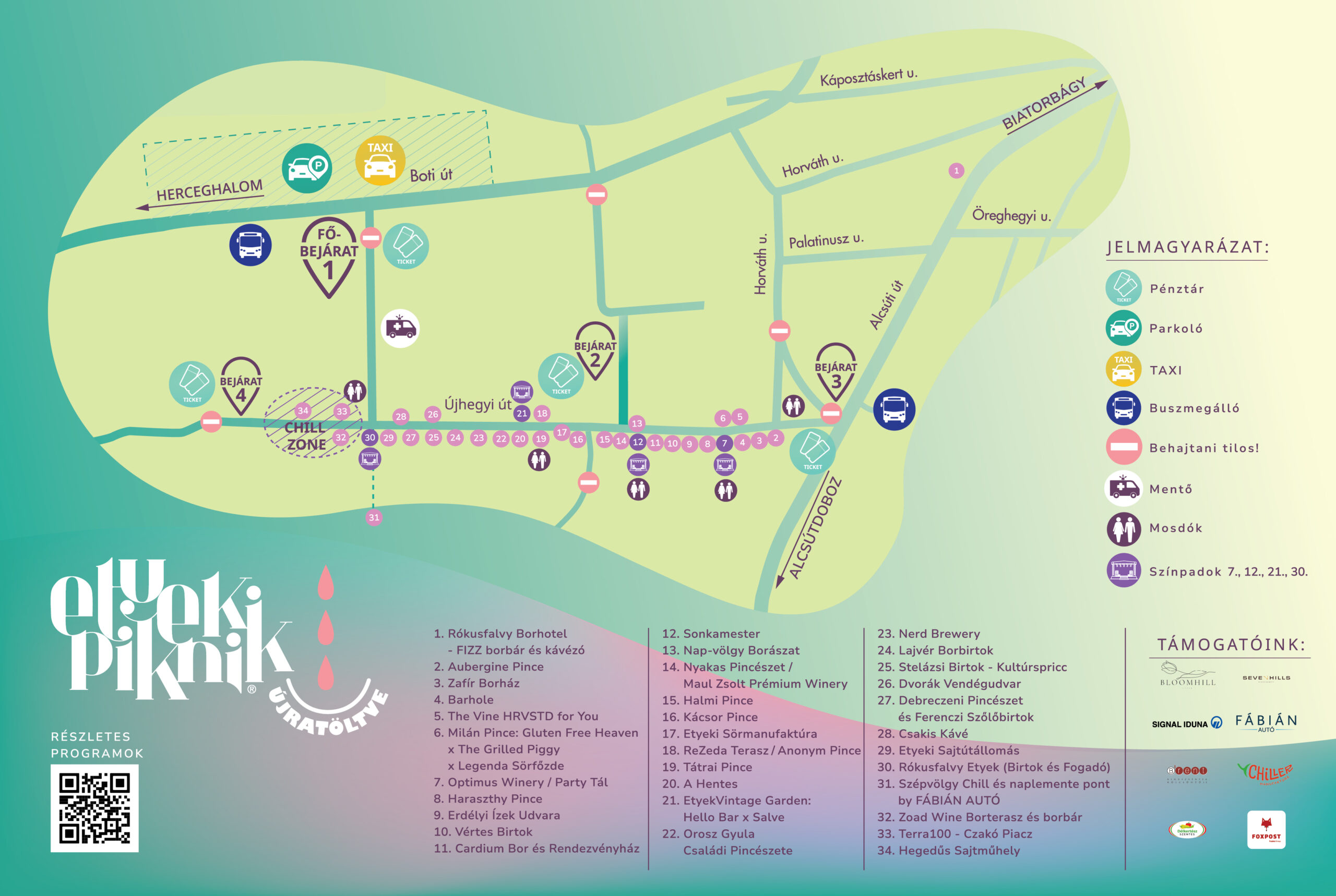 A helyszínen 3 belépési ponttal készülünk: a parkoló melletti főbejárat (Boti út), a Sonkamester alatti Boti köz, illetve a Gasztrosétány autóbuszforduló felöli vége).